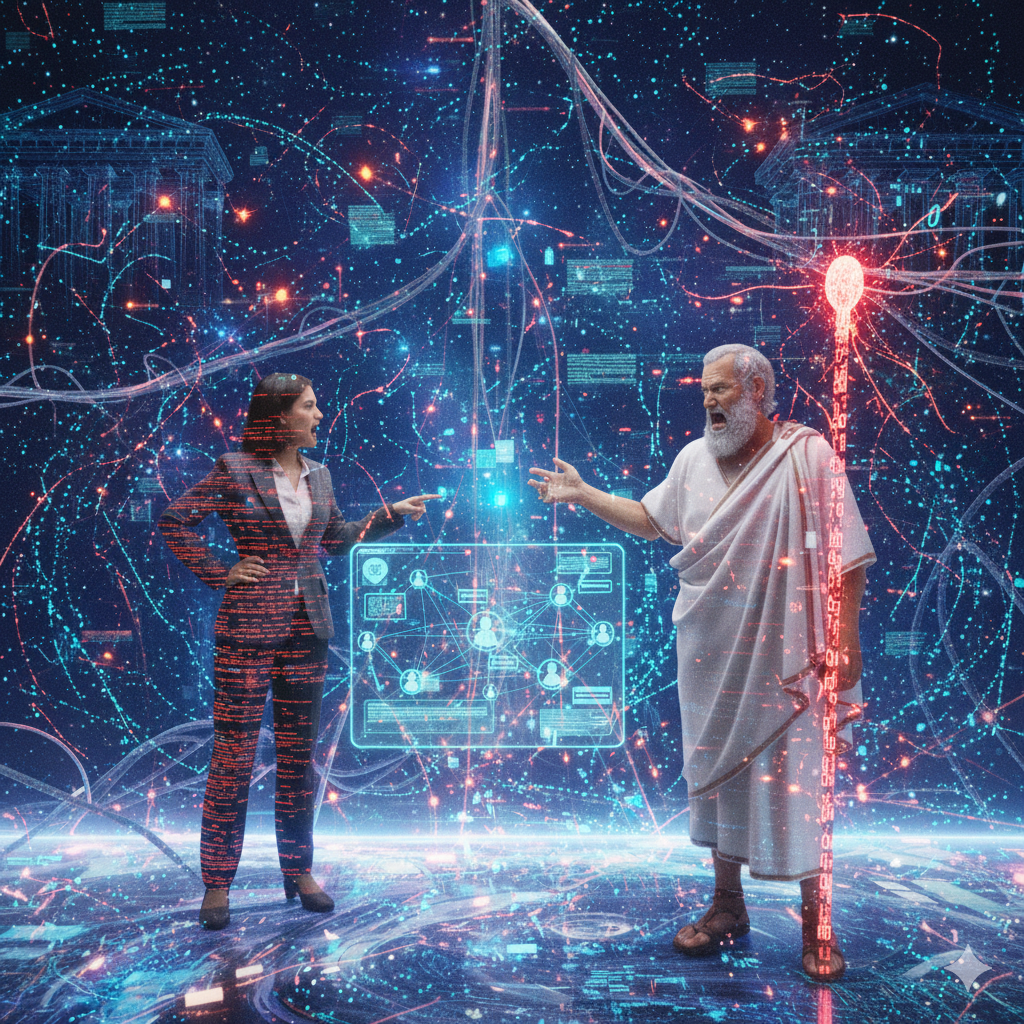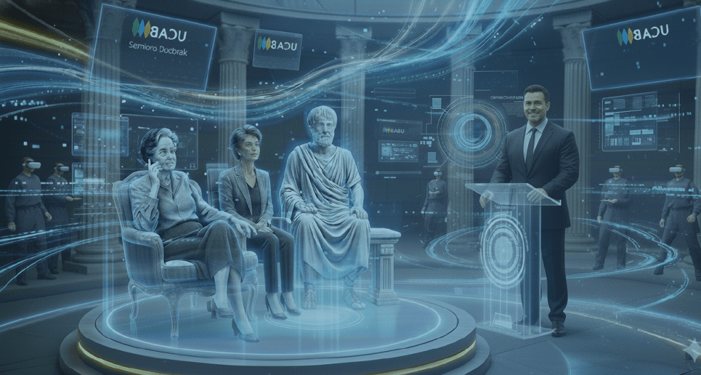 Así, se abrió ante nosotros un universo visualmente creativo, convergente-divergente, capaz de situar a personajes célebres de la antigüedad y confrontarlos con voces del pensamiento contemporáneo, en un mismo podio, a veces con la mediación del estudiante virtualmente presente. La pregunta propuesta fue ¿Cómo podemos imaginar y construir una ética de las tecnologías emergentes que fortalezca la democracia, la cooperación y el respeto a la autonomía en la Sociedad del Conocimiento?