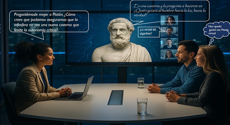 Decidí diseñar y proponer, para el cierre del curso una ¨Tertulia virtual ética e inmersiva¨ en la cual pudiéramos crear una atmósfera de diálogo cruzado, con el apoyo de modelos de IA. La idea despertó gran entusiasmo entre los doctorantes, quienes desbordaron el Foro con sus propuestas y sus interpelaciones. Elevaron la intensidad de la reflexión, tanto en contenido como en planteamientos densos y con sentido. Y desarrollaron animaciones que representaron las escenas de la tertulia, muy bien logradas, con muestras de la comprensión profunda de autores como Floridi, Zuboff, Cortina, Coeckelbergh y clásicos de la filosofía.